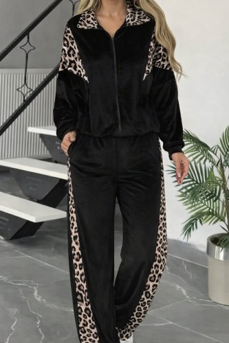 Kadın uzun kollu önden fermuarlı leopar detaylı kadife bluz ve pantolon ikili takım
