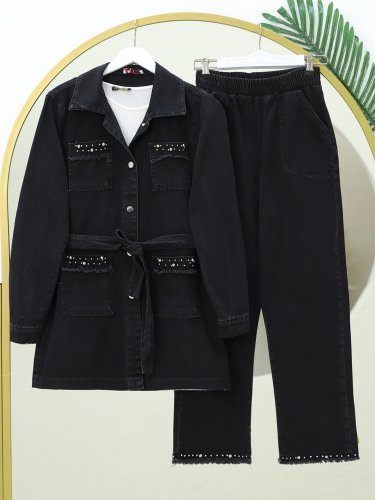 Taş Detaylı Ceket Pantolon Kot Takım Siyah