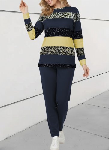 Kadın uzun kollu bisiklet yaka çizgili desen iki iplik bluz ve pantolon ikili takım