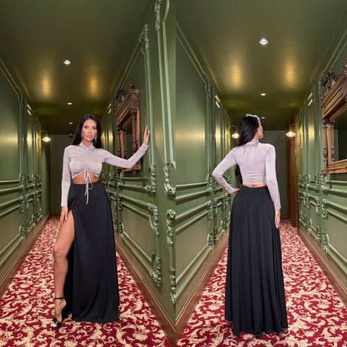 • Kadın asansör büzgü detay krom ve derin yırtmaçlı Maxi boy etek ikili takım