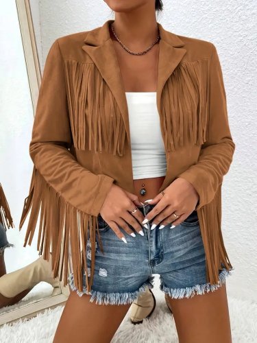 Kadın uzun kollu yakalı kısa püsküllü süet ceket