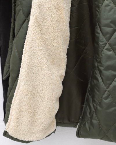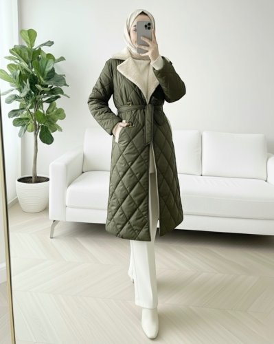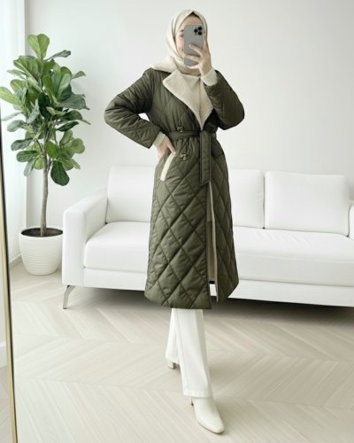 • Yakası Kürklü Beli Kemerli Düğmeli Astarlı Kapitone Mont Haki