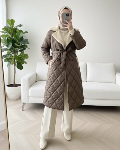 • Yakası Kürklü Beli Kemerli Düğmeli Astarlı Kapitone Mont Toprak
