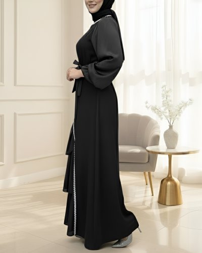 • Yakası Ve Eteği Taşlı Kemerli Saten Detaylı Krep Elbise Siyah