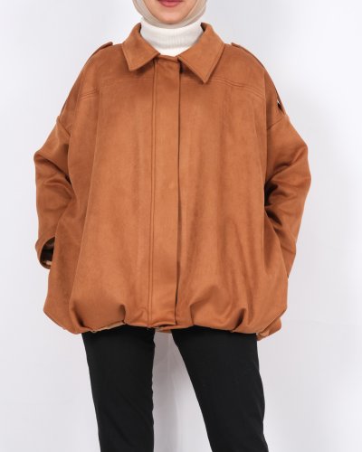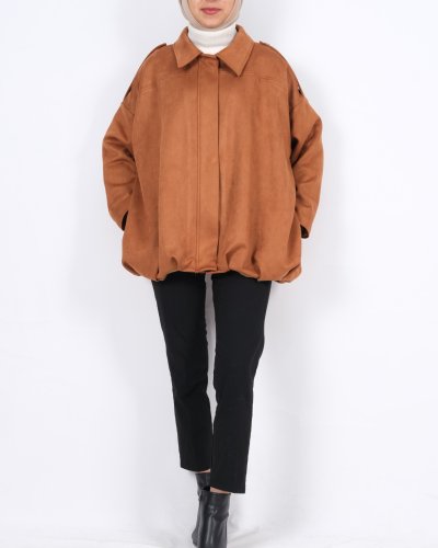 • Omzu Apoletli Önü Fermuarlı Astarlı Süet Ceket Taba