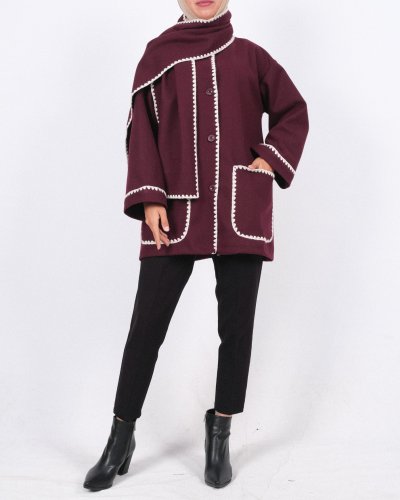 • Önü Düğmeli Atkılı Cepli Ceket Bordo