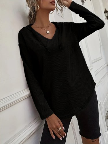 Kadın uzun kollu v yakalı kapşonlu waffle bluz