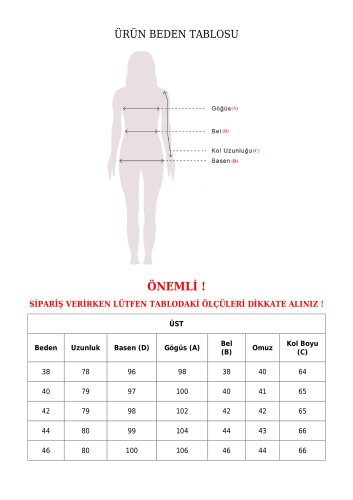 • Modelin Ölçüleri: Boy:165, Kilo:55, Göğüs:90, Bel:72, Kalça: 100