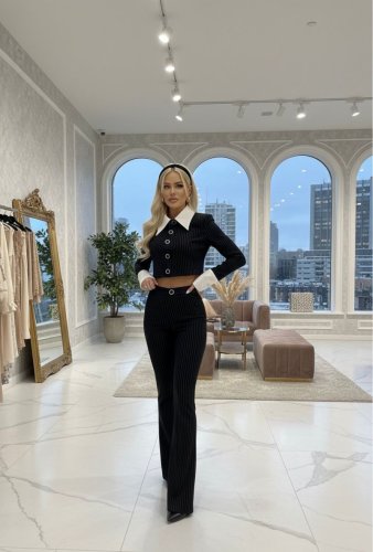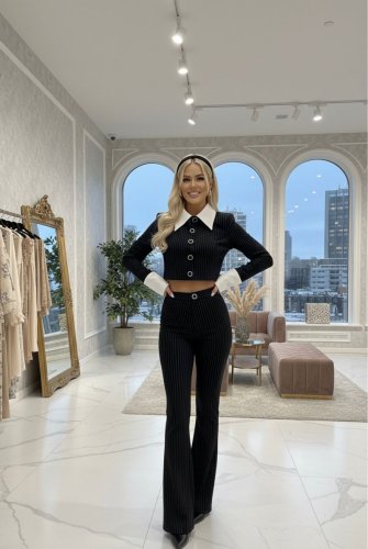 • Kadın gömlek detay çixgili ceket ve bol paça pantolon ikili takım