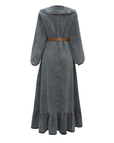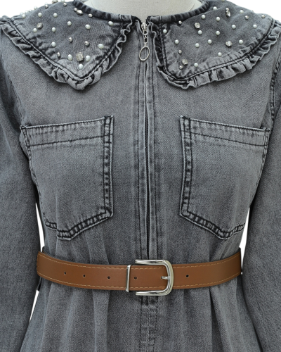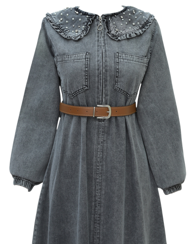 Bebe Yaka Yarım Fermuarlı İnci Detaylı Kemerli Kot Elbise Füme